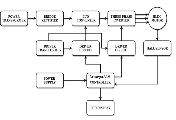 This project is proposed to control the speed of bldc motor by employing luo converter. The AC supply is applied to the bridge rectifier, the bridge rectifier converts ac supply into dc supply. That dc supply is applied to luo converter, the luo converter is boost the input voltage (i.e) if input 15v dc means luo converter output voltage is greater than 15v dc voltage. That dc voltage is given to the three phase inverter,it converts the dc voltage into three phase ac voltage. Three phase ac voltage is connected to the BLDC motor. The bldc motor have hall sensor. The hall sensor output is feedback to the controller. The three phase inverter Pulse depends on the hall sensor of bldc motor.The DSPIC controller key functions are used to control the bldc motor speed.